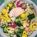 - To the dressed pasta, add the tomatoes, banana peppers, sliced bell pepper, apple, mozzarella, roasted broccoli, and any extras that you like (this is a great way to use up any veggies you’ve got in your fridge). Toss a bit and serve. I like this best at room temp, but it also works well cold, right from the fridge. This will keep nicely in the refrigerator for 3 to 4 days.