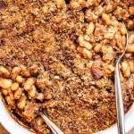 We’ll stir together the rest of the parmesan and the crunchy panko breadcrumbs and coat them with a good drizzle of olive oil. Scatter them over the beans and send it into a 400 degree oven. I like to lay a large piece of foil over the dish for the first 10 minutes, and then I remove it during the last 20 or so. If your topping starts to look too brown, just put the foil back on and you’re good to go.