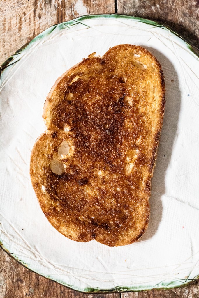 - We’re going to pre-toast our bread now. Add 2 tablespoons of salted butter (give or take) to a large skillet set over medium heat, and allow it to just melt. Add the bread slices to the pan, working in batches as needed, and toast on both sides until light golden brown and well, toasty.