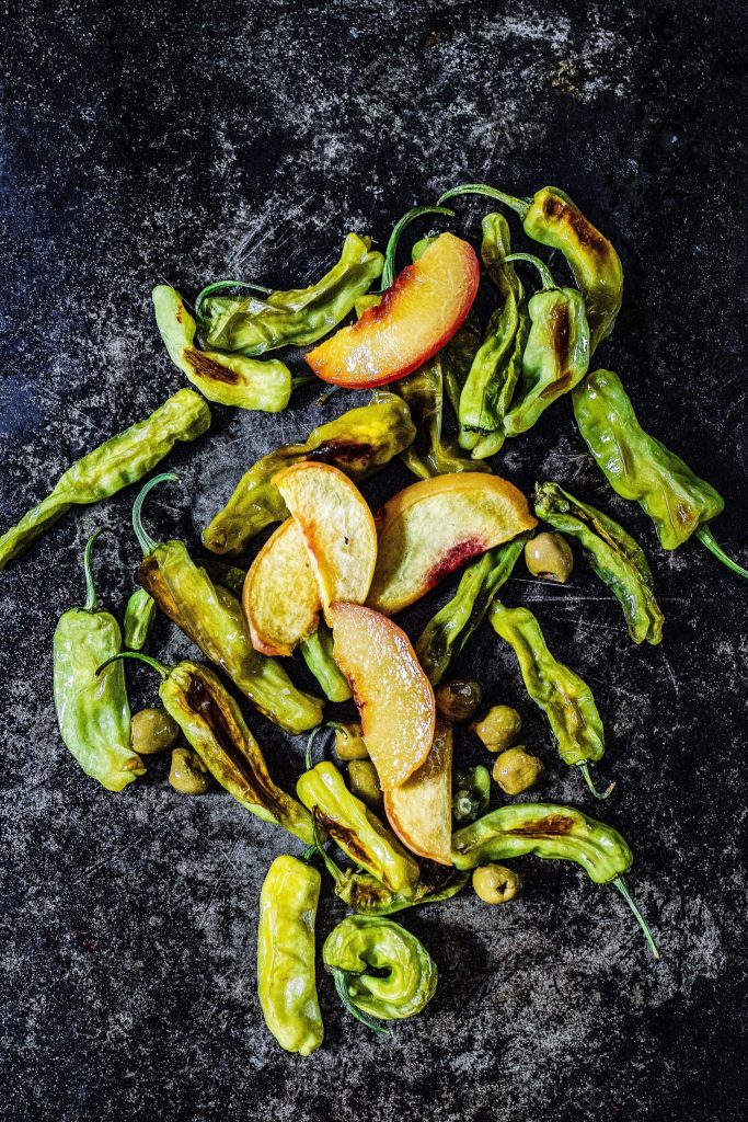 - Place the peaches, olives, and shishitos on a second large baking sheet (or use the same one as the granola after transferring it elsewhere). Toss with the olive oil and roast until charred and lightly browned; about 15 to 18 minutes.Â